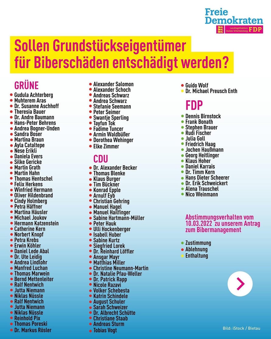 Gestern wurde mit Grün-Schwarzer Mehrheit unsere Forderung nach der Einrichtung eines Biberfonds und einer Weiterentwicklung des Bibermanagements abgelehnt und damit auch eine mögliche Entschädigung für Grundstücksbesitzer, die stark von Biberschäden betroffen sind.