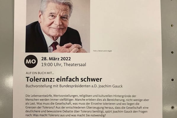 Gestern war ich Gast im Augustinum Meersburg bei der Eröffnungsveranstaltung mit Bundespräsidenten a.D. Joachim Gauck. In seinem Buch „Toleranz: einfach schwer“ gibt Joachim Gauck wertvolle Denkanstöße zu den aktuellen Fragen unserer Zeit. Das abwechslungsreiches Kulturprogramm präsentiert das Augustinum Meersburg in Zusammenarbeit mit seinem langjährigen Kooperationspartner, dem Kulturverein Meersburg e.V., in der Veranstaltungsreihe „Auf ein Buch mit…“. Elf hochkarätige Gäste regen mit Ihren Buchvorstellungen zum Nachdenken und Nachspüren an.