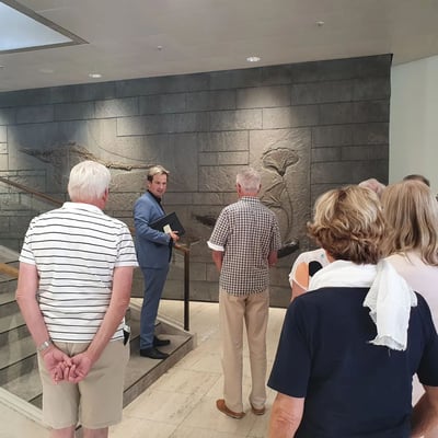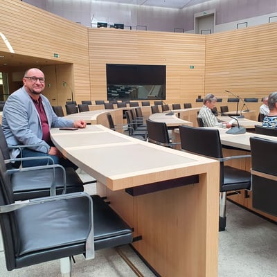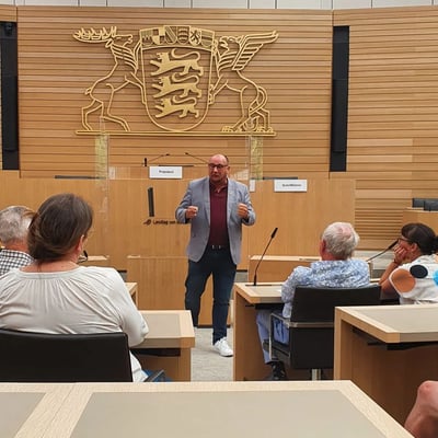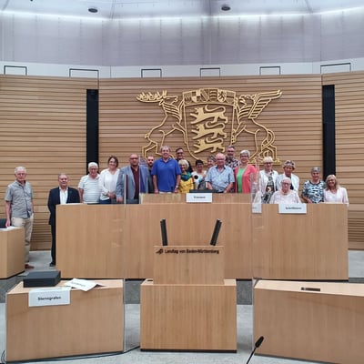 Heute begleitet mich eine Gruppe aus meinem Wahlkreis 67 Bodensee bei schönstem Wetter nach Stuttgart um mehr über die Abgeordneten- und Landtagsarbeit zu erfahren. Es ging mit dem Zug los aus dem Wahlkreis nach Stuttgart. Jeder der noch keines hatte, hat extra für die Landtagsfahrt ein 9 Euro-Ticket für den Nahverkehr erhalten. In Stuttgart angekommen gab es erst mal eine ordentliche Stärkung im Restaurant des Landtags, dem Plenum. Nach Maultaschen mit Kartoffelsalat ist man bei der anschließenden Führung gleich viel aufnahmefähiger. Im Landtagsgebäude gibt es einige Ecken die von einer langen Geschichte zeugen. So z.B. das Gedenkbuch in dem auf jeweils zwei Seiten an die Abgeordneten aus Baden-Württemberg die während des Nationalsozialismus verfolgt wurden, erinnert wird, oder die Originalfossilien die im Eingangsbereich zu sehen sind. Herr Dr. Deppisch vom Besucherdienst hat der Gruppe diese Geschichte nähergebracht und außerdem in einem Spiel gemeinsam mit der Gruppe die Wahl des Ministerpräsidenten nachgestellt und über die Abläufe während der Plenarsitzungen informiert. Der Gesprächsbedarf im Anschluss an die Führung, vor allem aktuelle Themen den Wahlkreis betreffend, war noch groß. In einer Gesprächsrunde bin ich auf die Fragen der Teilnehmerinnen und Teilnehmer eingegangen, wir haben die Biber- und Kormoranproblematiken, Wildübergänge oder die durch den Waschbären verursachten Probleme besprochen. Genau dieser Austausch ist wie ich denke, für beide Seiten sehr wertvoll. Ich kann mit meinem Hintergrundwissen informieren und bekomme andererseits mit was für Themen die Menschen bewegen. Als Abschluss gab es noch Wasser oder Kaffee und eine tolle Aussicht über Stuttgart auf der Dachterrasse des Abgeordnetengebäudes!