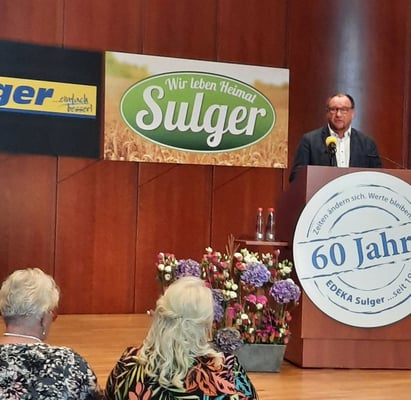 Es freut mich immer, wenn ein mittelständisches Unternehmen so eine Erfolgsgeschichte schreibt, denn der Mittelstand ist das Rückgrat unserer Gesellschaft. Edeka Sulger ist eine besondere Erfolgsgeschichte hier in unserer Region. In 60 Jahren vom Tante-Emma-Laden zum Nahversorger-Imperium mit 9 Filialen, ca. 10.500 qm Verkaufsfläche und knapp 400 Mitarbeiter, davon 10% Auszubildende. Als Nahversorger haben Sie täglich dafür zu sorgen, dass die Menschen in dieser Region frische Waren aus der Region in Ihre Einkaufstaschen bekommen. Gerade in diesen Zeiten ist es wichtig, dass unsere ansässige Landwirtschaft verlässliche Partner haben, damit sie ihre heimischen Produkte bestmöglich vermarkten können. Als Landwirt und als Mitglied im Landwirtschaftsausschuss im Landtag von Baden-Württemberg ist es mir ein besonderes Anliegen, die heimischen Landwirtinnen und Landwirte zu unterstützen, wo immer es nur möglich ist. Deshalb ist das Konzept „Aus der Region – für die Region“ zukunftsweisend für die Erzeuger und die Verbraucher. Ich wünsche dem Unternehmen und ihren knapp 400 Mitarbeiterinnen und Mitarbeiter weiterhin viel Erfolg und weiterhin ein gutes Gelingen.