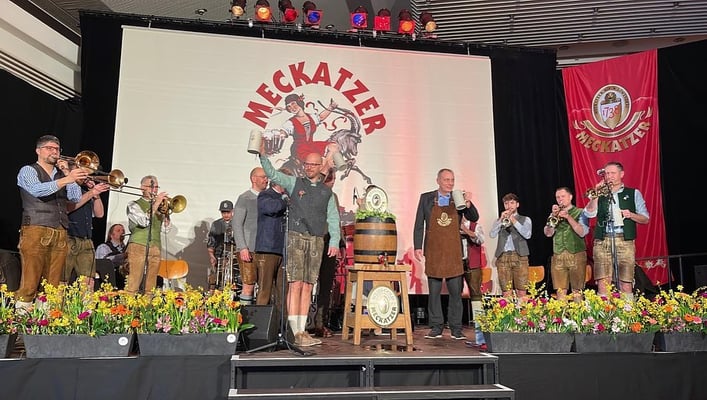Bürgermeister Andreas Köster stach unter Aufsicht von Meckatzer-Vertreter Uli Stegmann das Starkbierfass an und läutet hiermit die Fastenzeit ein! Warum eigentlich Starkbier in der Fastenzeit