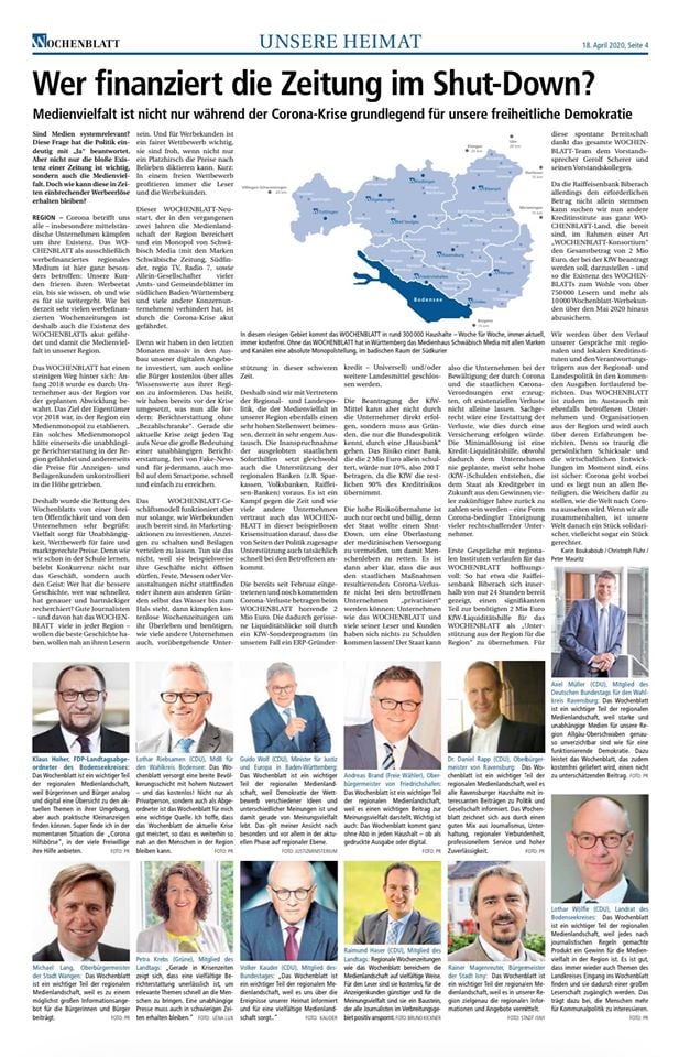 Medienvielfalt ist nicht nur während der Corona-Krise grundlegend für unsere freiheitliche Demokratie "Das Wochenblatt ist für mich ein wichtiger Teil der regionalen Medienlandschaft, weil Bürger und Bürgerinnen analog und digital eine Übersicht zu den aktuellen Themen in ihrer Umgebung, aber auch praktische Kleinanzeigen finden können" Aus dem Wochenblatt E-Paper, Seite 3 und 4: https://www.wochenblatt-online.de/…/Ausgaben_202…/index.html