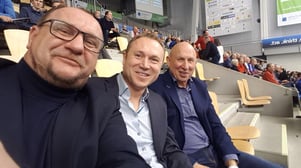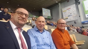Schöner Volleyballabend mit meinen Freunden Karl-Heinz Wegis und Josef Schneider und einem verdienten Sieg der Häfler gegen den finnischen Meister!